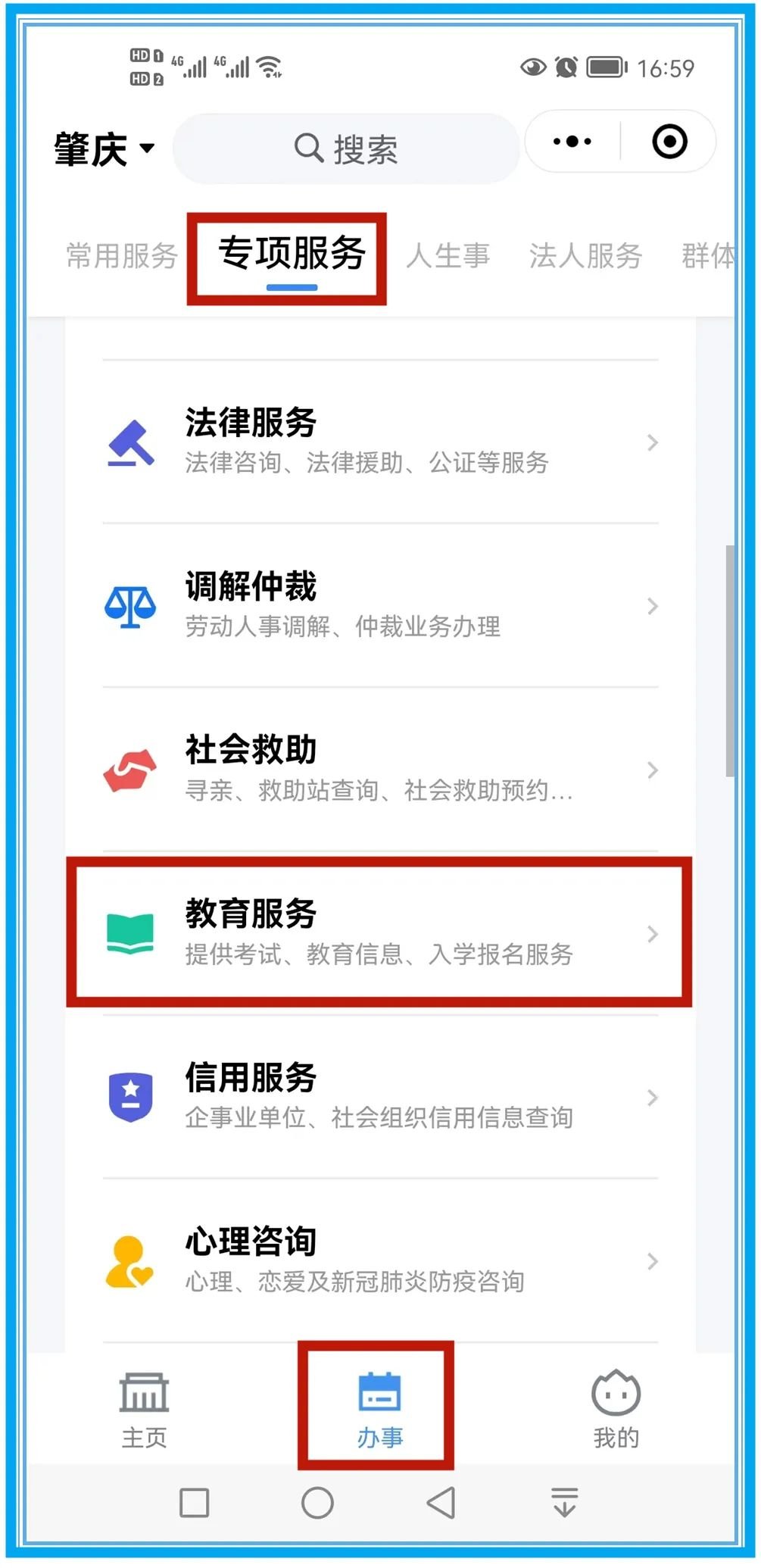 第一步:从粤省事小程序首页“办事”~“专项服务”的“教育服务”进入报名系统。