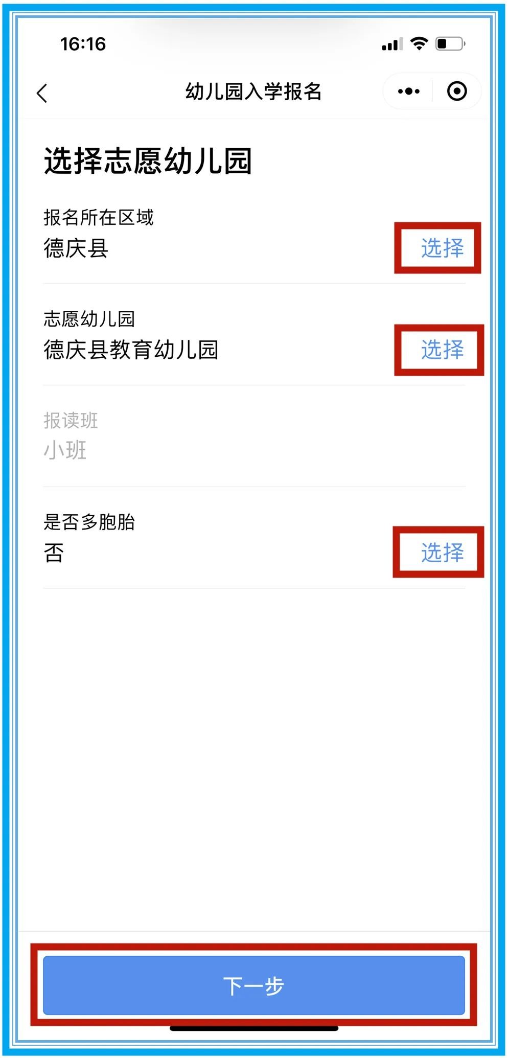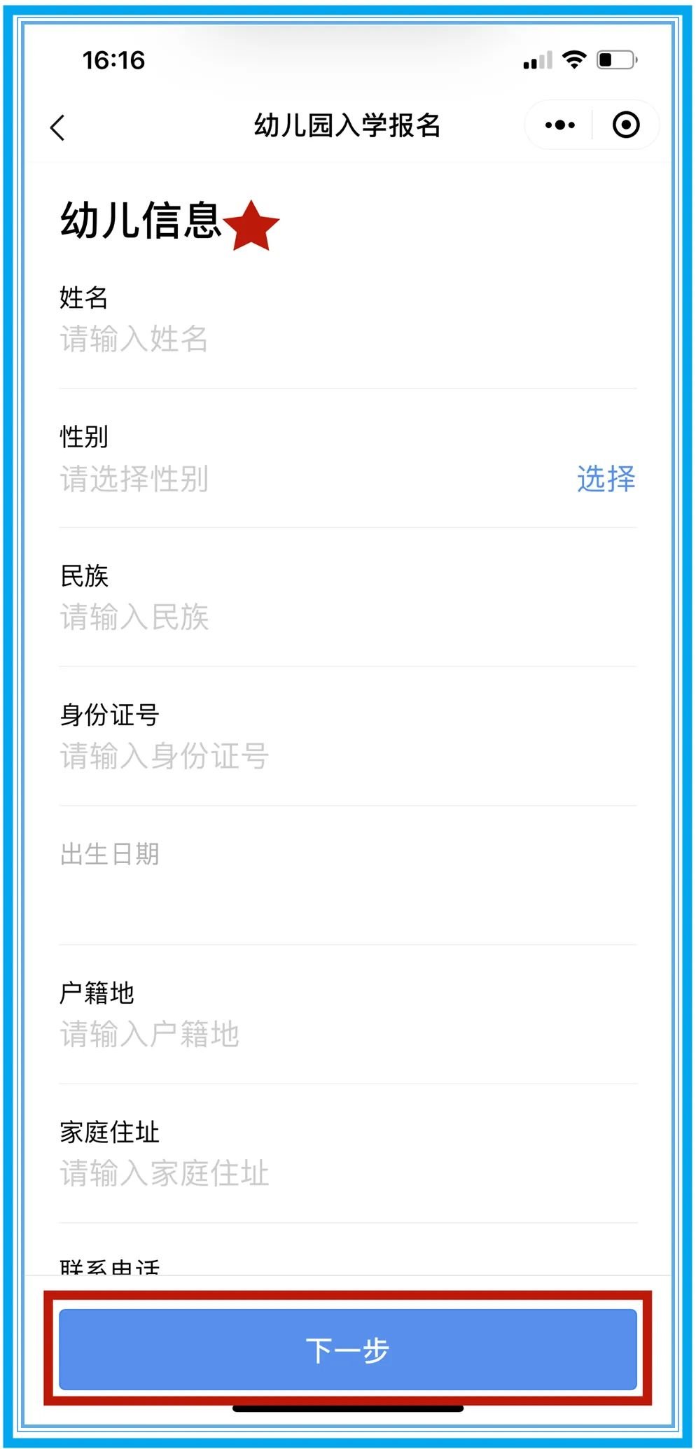 第七步:填报幼儿信息,然后点击“下一步”。