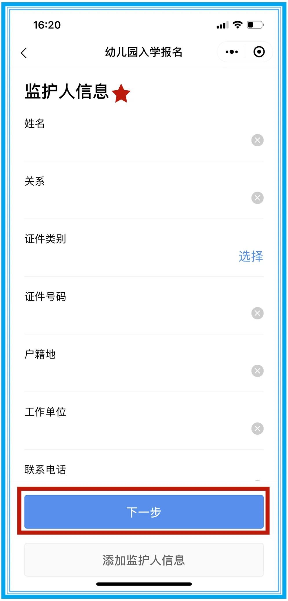 第八步:填报监护人信息,然后点击“下一步”。