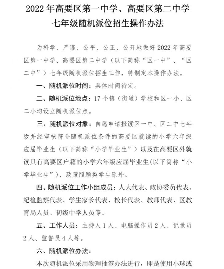 1.各镇(街道)学校小学毕业生申请报读区一中、区二中七年级人数分别多于招生控制数的,实行随机派位方法招生。