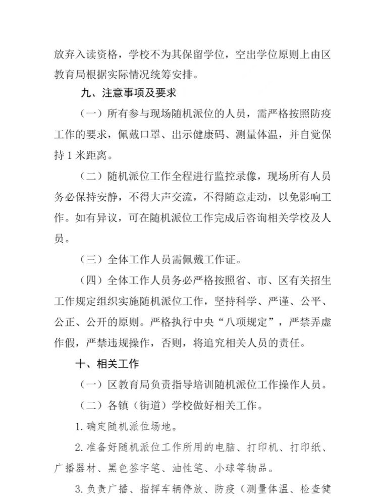 3.随机派位以镇(街道)学校为单位,由人大代表、政协委员代表、纪检监察代表、学生家长代表、校长代表、教师代表、区教育局人员、初级中学人员等成员组成工作小组,通过随机派位方法确定本镇(街道)学校推荐入读区一中、区二中七年级学生名单,额满即止。
