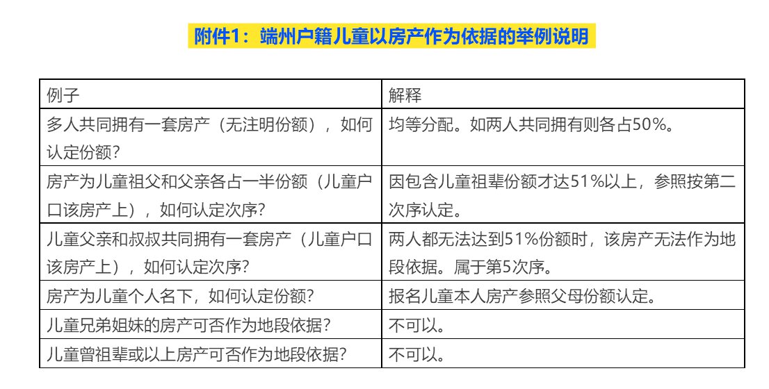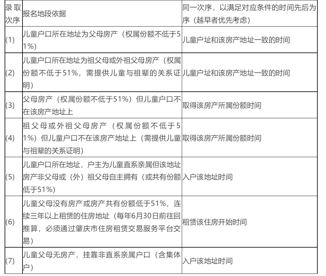 端州户籍儿童可以选择以下几种情况作为报名地段依据,部分学校如因学位严重不足无法全部接纳报名儿童,按照以下(1)-(7)的次序及相关先后条件安排学位(同一条件以取得该次序条件的时间先后为序,其中最近三学年未在正规幼儿园实际在册就读的儿童,在相同次序中最后安排,如因家庭经济或身体原因未接受学前教育者提交佐证则不受该限制)。如学校报名人数超额导致无法在报名地段安排的儿童,由教育部门分流生源统筹安排学位。