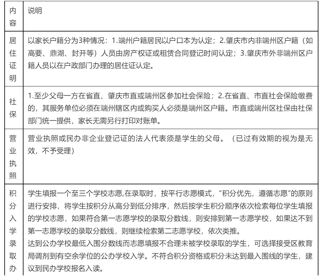 (1)7月8日—12日家长网上申请(登录微信小程序“粤省事”,进入“教育服务”),积分报名需上传资料:①学生及父母的户口簿;②学生父或母为法人的个体工商营业执照(此项仅学生父母无缴纳社会养老保险者需提供)③学生父母双方或一方的居住证(此项仅学生父母是非肇庆市户籍居民提供;肇庆市户籍居民凭房产或租赁合同登记时间认定居住证明);④学生父母或祖辈有效的房产证明或租赁证明(如已购房但未取得不动产权证的,提交住不动产中心的查档证明)。