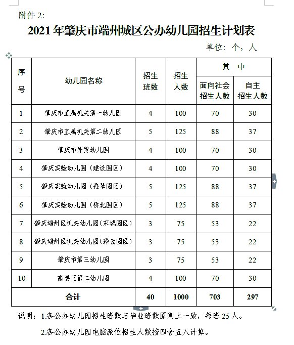 2021年秋季端州城区10所公办幼儿园计划招生40个小班共1000人(按每班25人计算)。