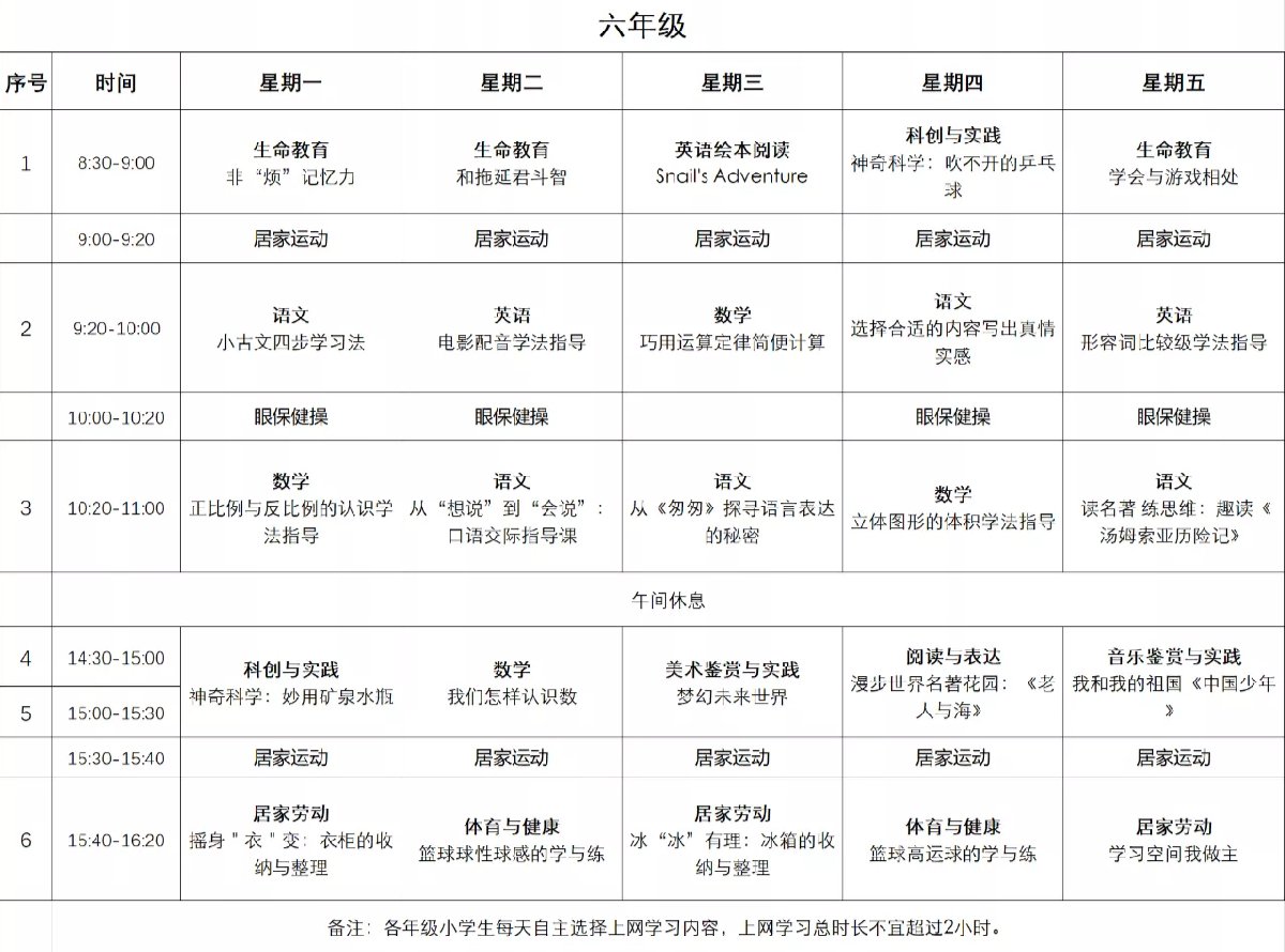 茂名粤课堂小学六年级课程表