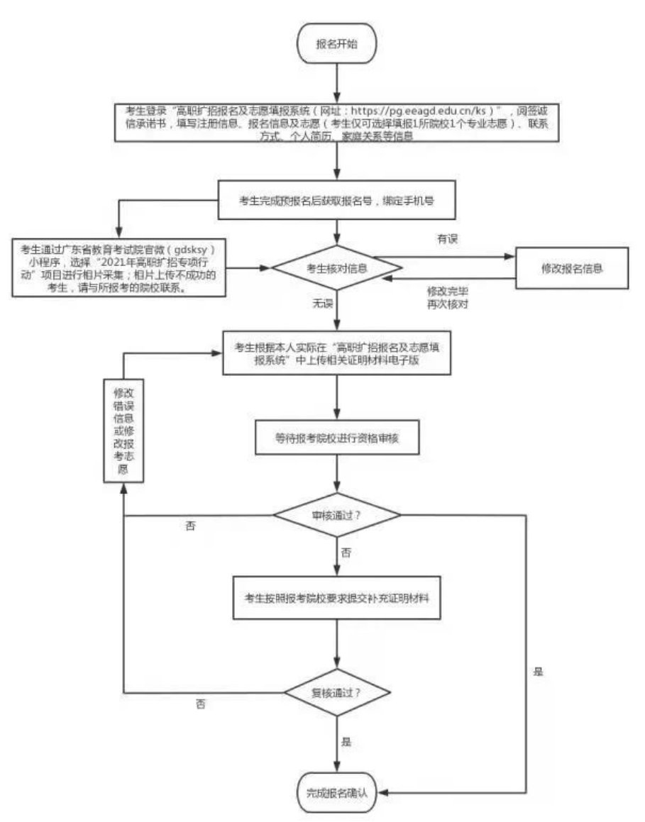 考生登录广东省高职扩招报名及志愿填报系统(点击此处),根据系统指引阅签诚信承诺书,填写注册信息、报名信息及志愿信息、联系方式、个人简历、家庭关系等信息,获取报名号、绑定手机号,通过微信小程序采集相片并经核对信息无误后根据实际按照要求上传相关证明材料电子版。高职扩招报名及志愿填报工作全部在网上进行,时间为9月22日14:00至9月27日14:00,逾期不再办理相关手续,考生不得再修改已填报个人信息及院校专业志愿。相片上传不成功的考生,请与所报考的院校联系。