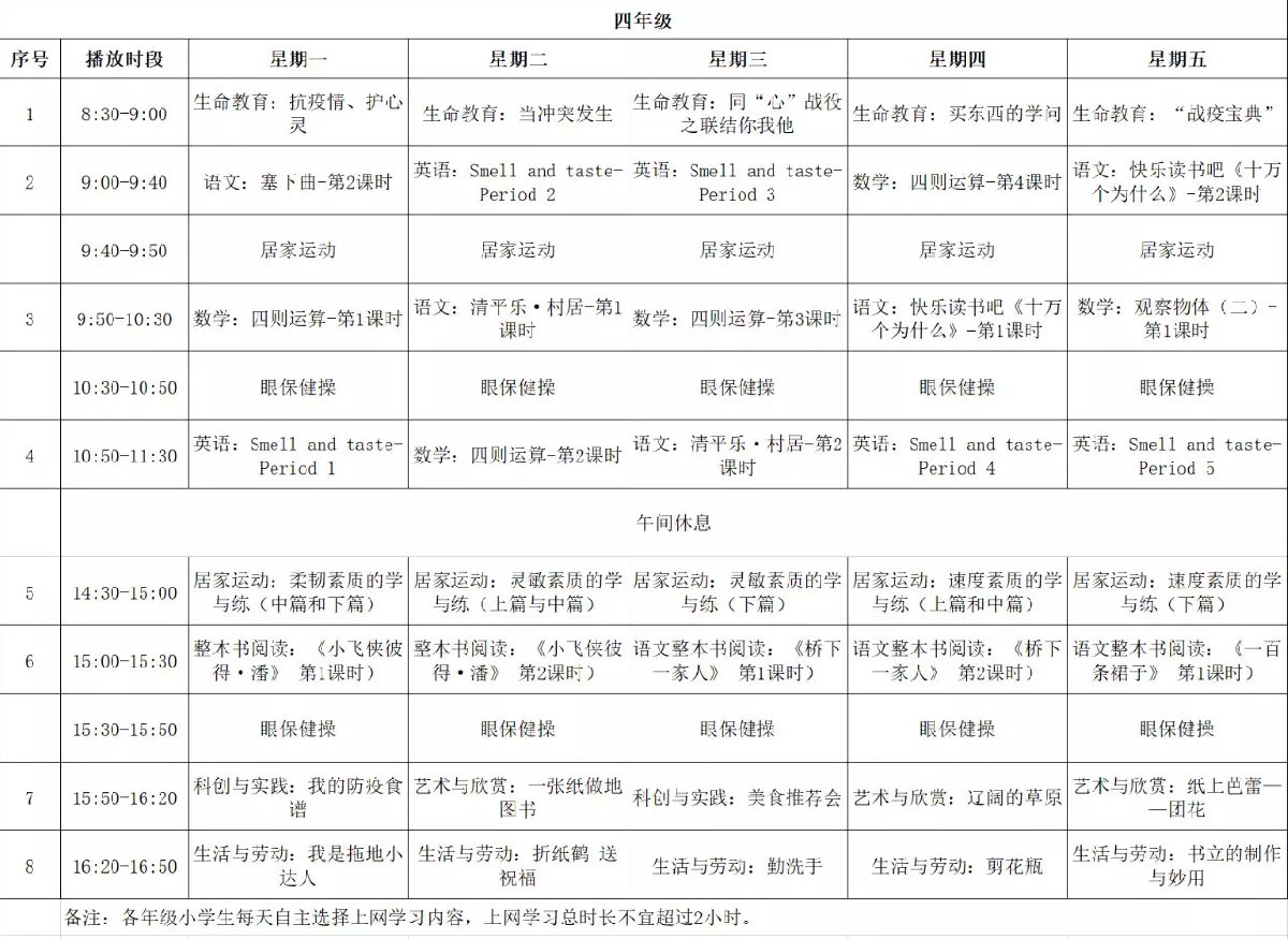 茂名粤课堂小学四年级课程表(广东小学课程表)