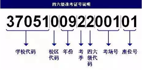 前5位是学校代码,第6位是学校的校区代码,第7-8位是考试年份。如2016年考试此处应为16,16代表2016年,第9位是该年中第几次四六级考试,上半年是第1次,下半年是第2次,那么2016年12月就是2。第10位是四六级类别,四级是1,六级是2。第11-13位是考场号,比如你在100考场的,那就是10014考场的就是014。第14-15位是座位号。