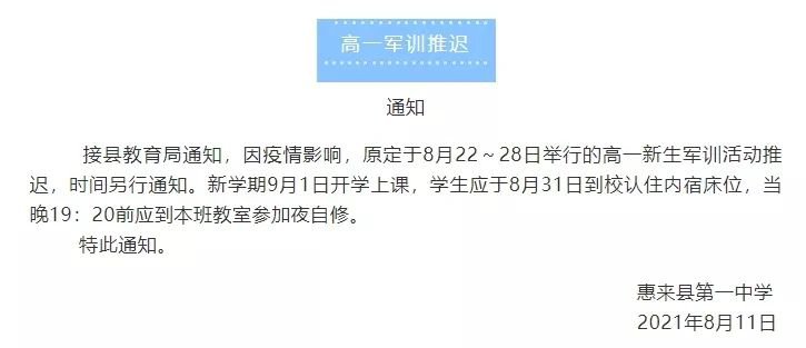 原定于8月25日—31日举行的高一新生军训活动推迟,时间另行通知。
