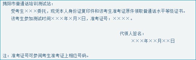 ②受考生委托到现场领取普通话水平等级证书的,领取证书时,代领人须提供考生二代身份证原件及准考证原件,代领人身份证原件及复印件一份。由代领人在身份证复印件背面加以说明。“说明”内容可参照下面文字:
