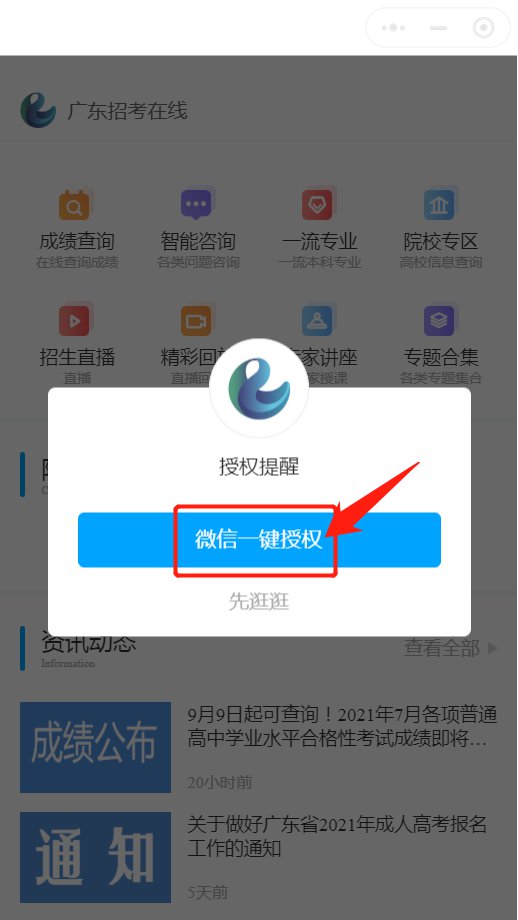 1.进入“广东招考在线”小程序(点此进入),点击“微信一键授权”。