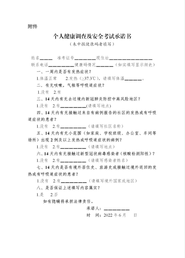 1. 考生于考前准时下载并打印准考证。未申报健康码的考生要如实填写个人健康调查表,签署《健康承诺书》,于考试当天进入考点时交给考试工作人员。考前要认真阅读考生防疫与安全须知,熟知考试的各项要求。