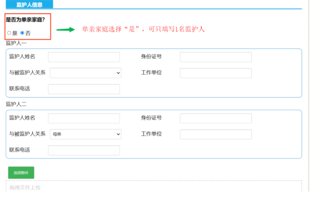 2、【监护人信息】【监护人信息】包括新生父亲和母亲的信息,用户根据系统提示填写即可。然后完成附件上传。