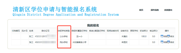 “保存”或“保存提交”成功后系统自动跳转到我的报名页面,同时填报公办、民办学校的会生成一条公办、一条民办报名信息: