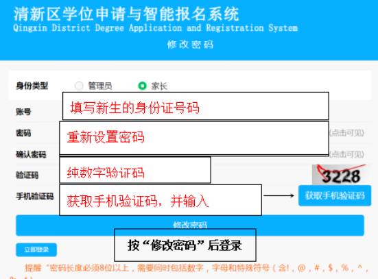 【关于“忘记密码”】忘记密码时,请使用“忘记密码”功能,输入新生身份证号码,新设置的密码,填写数字验证码,使用注册时确认的手机号码获取手机验证码,填写完毕后按“修改密码”,然后登陆系统。
