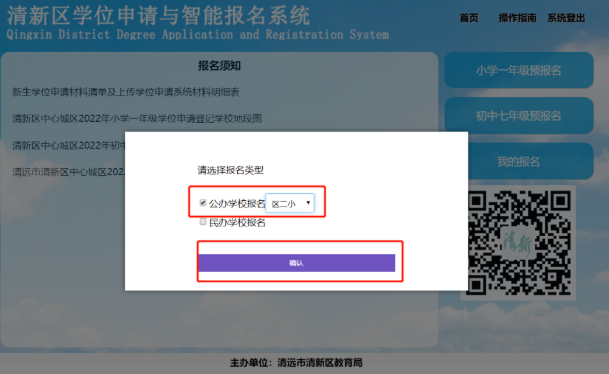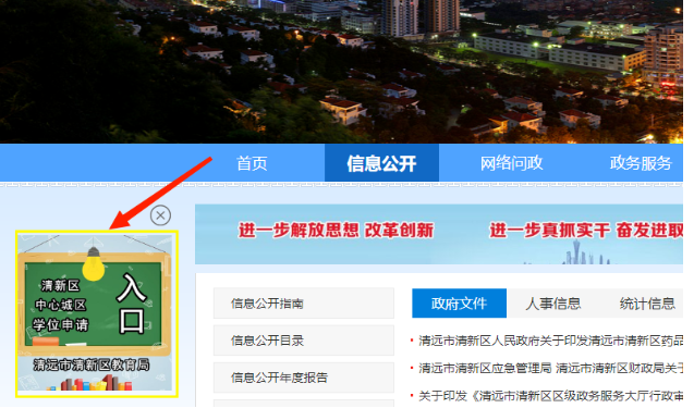 1、报名电脑端入口打开网页,访问清远市清新区人民政府门户网站,通过政府网上的入口进入“清新区学位申请与智能报名系统”。