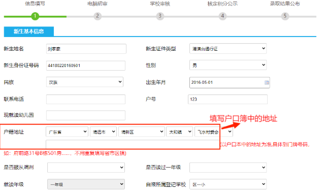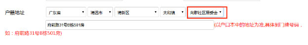 填写户籍地址时,请根据户口簿上的地址,逐级选择省/市/区/镇/村(居)委会,然后填入剩下的信息将地址补全至门牌号。太和镇户籍生务必选择村(居)委会,否则将影响户籍类型的判断。