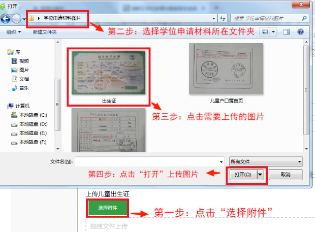 附件上传时,家长务必按要求上传全部学位申请材料,否则会影响审核结果。点击“选择附件”按钮,系统会弹出所需要的附件提醒(微信端按“?”键查看提示),选择对应图片并完成上传。用户可按此方法,完成“监护人”、“房产”、“社保”等信息证明材料的上传。如图: