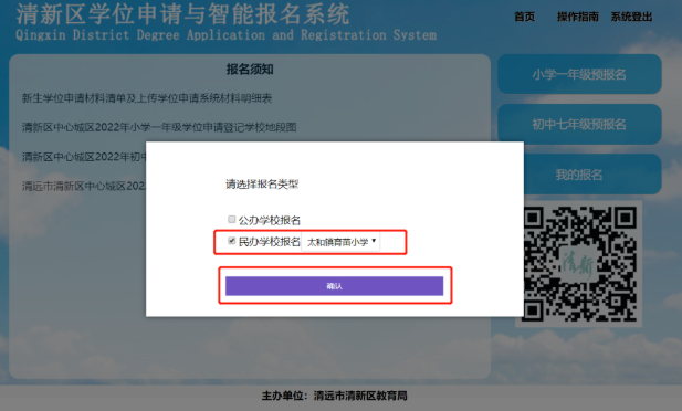 (一)选择报读学校点击“小学一年级预报名”后,在弹窗中勾选公办、民办学校报名。