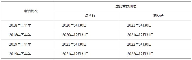 笔试成绩有效期延长:参加“2018年上半年至2019年下半年”各批次笔试,已通过的单科笔试科目成绩有效期延长1年,即成绩有效期由2年延长至3年成绩查询网站页面会及时更新有效期限