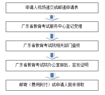 (一)邮寄申请材料办理:下载并按要求填写附件广东省教育考试院成绩证明申请表,同时附上申请人身份证复印件,邮寄至广东省广州市天河区中山大道西69号广东省教育考试院来访接待室蒋老师收(邮编510631)。