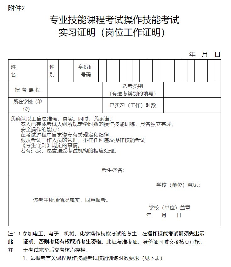 3.报考《电工》《电子》《机械》《化学》操作技能考试的考生,在参加该科目操作技能考试时须出示学校(单位)开具的《专业技能课程考试操作技能考试实习证明(岗位工作证明)》(格式见附件2),否则将不予参加该科目操作技能考试。