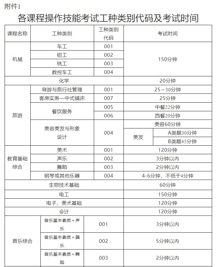 附件:1.各课程操作技能考试工种类别代码及考试时间