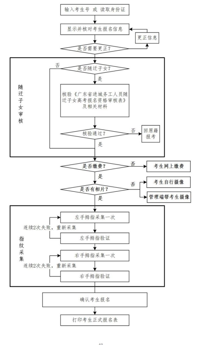 确认报名手续包括确认报名资格、校对和核准报考信息、采集指纹等。引进人才子女、现役军人子女、户籍从省外迁入广东省的考生、外省户籍随迁子女、香港学生、澳门学生、台湾省籍学生、外国侨民、三侨生、民族生、申请提供合理便利的残疾考生还需携带相应证明材料,到报名点办理报考手续(具体报名办法按《广东省2021年普通高校招生统一考试报名实施细则》进行)。