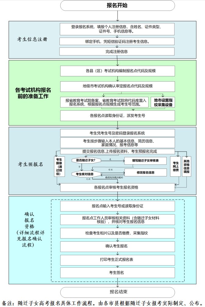 考生须在规定时间内(11月6日-10日)持身份证、户口簿、学籍学历等证明材料到市县招生办公室指定的报名点办理确认报名手续。