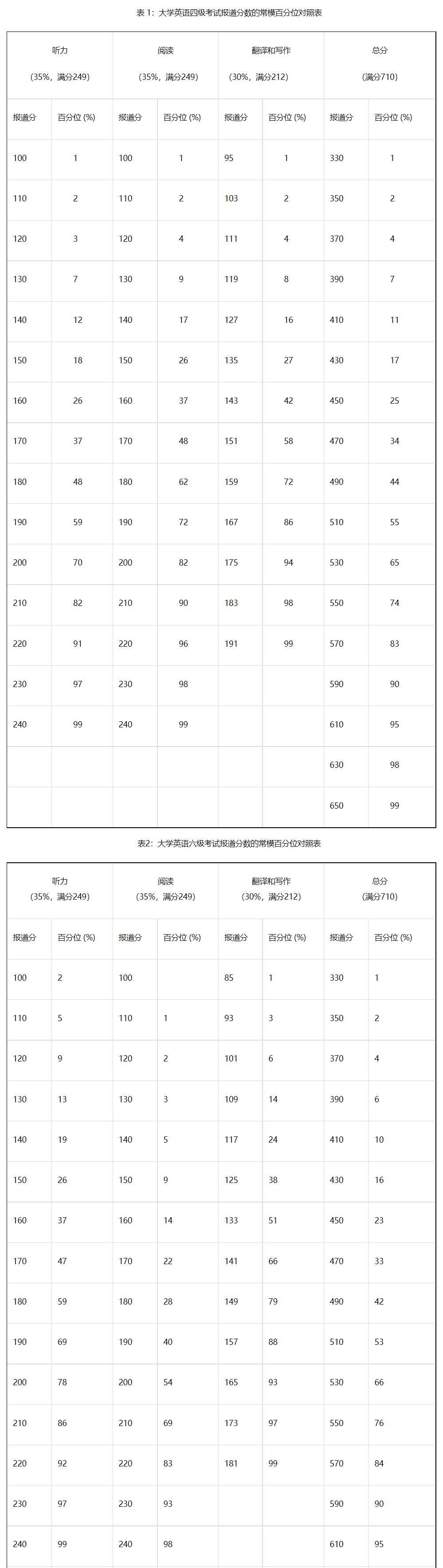 大学英语四、六级考试的分数报道采用常模参照方式,不设及格线。四级考试的常模群体选自全国16所高校的约三万名非英语专业的考生;六级常模群体选自全国五所重点大学的约五千名非英语专业的考生。每次考试等值后的卷面分数都参照常模转换为报道分。四、六级考试报道总分为710分,计算公式为: