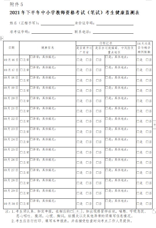 2021年下半年清远教资笔试考生健康监测表(点击下载)