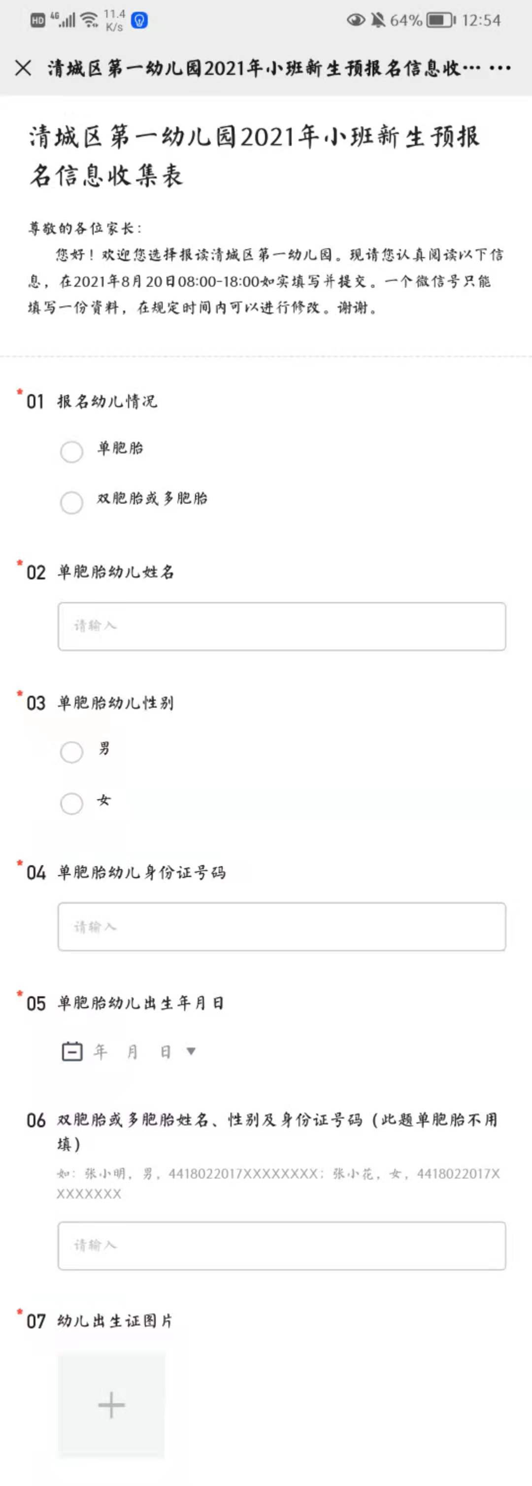 家长打开微信扫一扫二维码,进入《清城区第一幼儿园2021年小班新生预报名信息收集表》。温馨提示:家长只能选择一所符合条件的公办幼儿园进行报名,如有多报,一经核实,将取消报名资格。