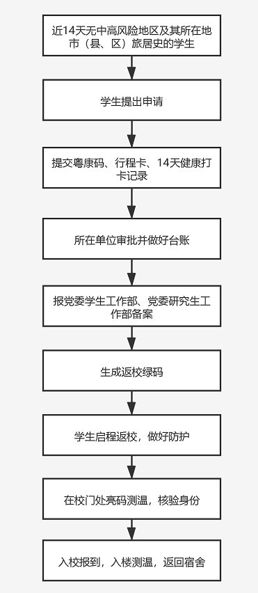 1.经学生个人申请、所在单位逐一严格审核学生返校申请材料(核实一卡一码一表,即行程卡、粤康码和返校健康申报表)、所在单位严格做好登记后进行相应返校审批,并分别报党委学生工作部、党委研究生工作部备案。申请流程完成后学生方可按照学院通知时间返校。