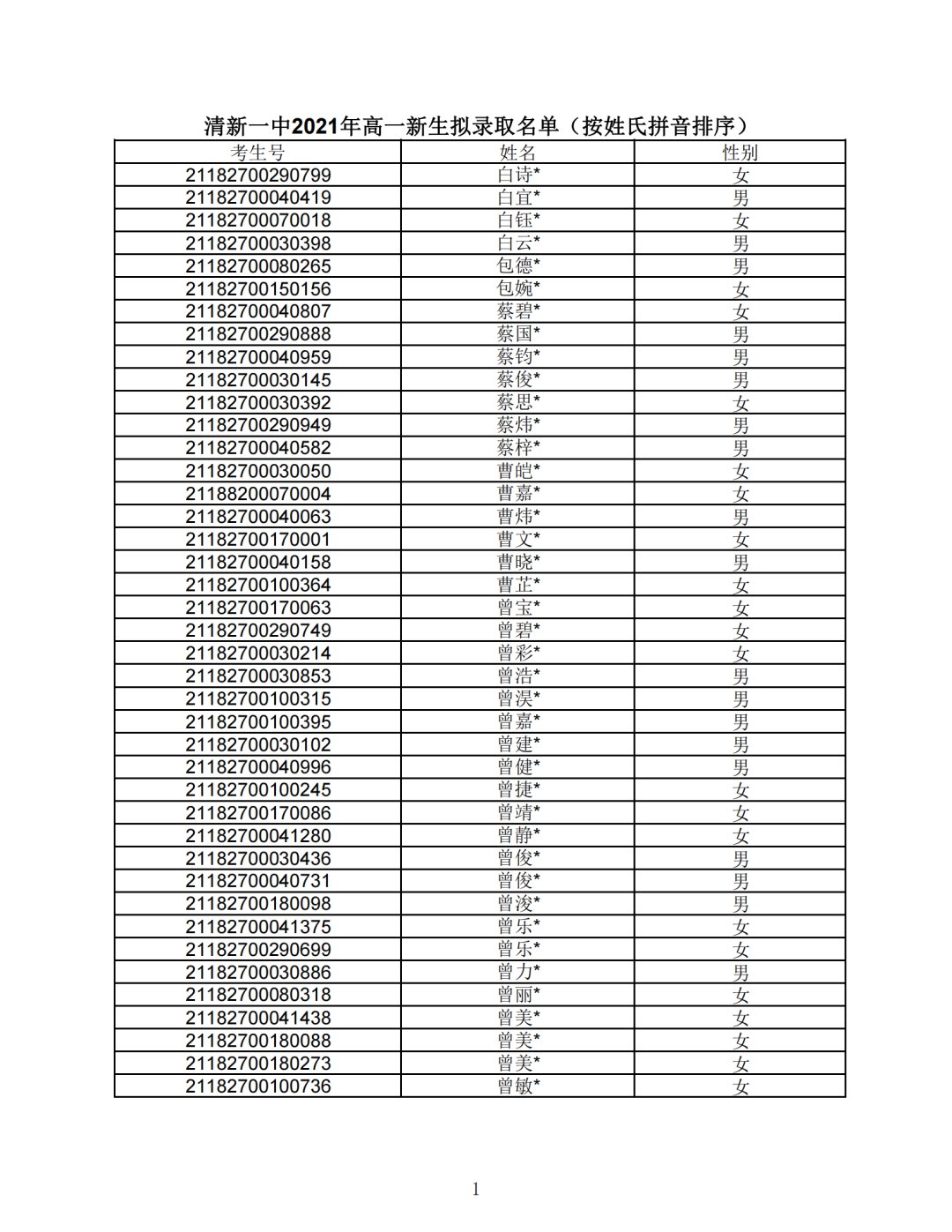 清新区第一中学2021新生录取名单(清新区第一中学2021分数线)