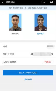 识别不通过时可以点击人脸识别结果查看不通过原因并重新尝试,当多次尝试不过后可以选择通过人工审核方式提交(需补充身份证正反面、手持身份证相片),等待人工审核(审核仍不通过的,及时与当地自学考试办公室联系咨询)。