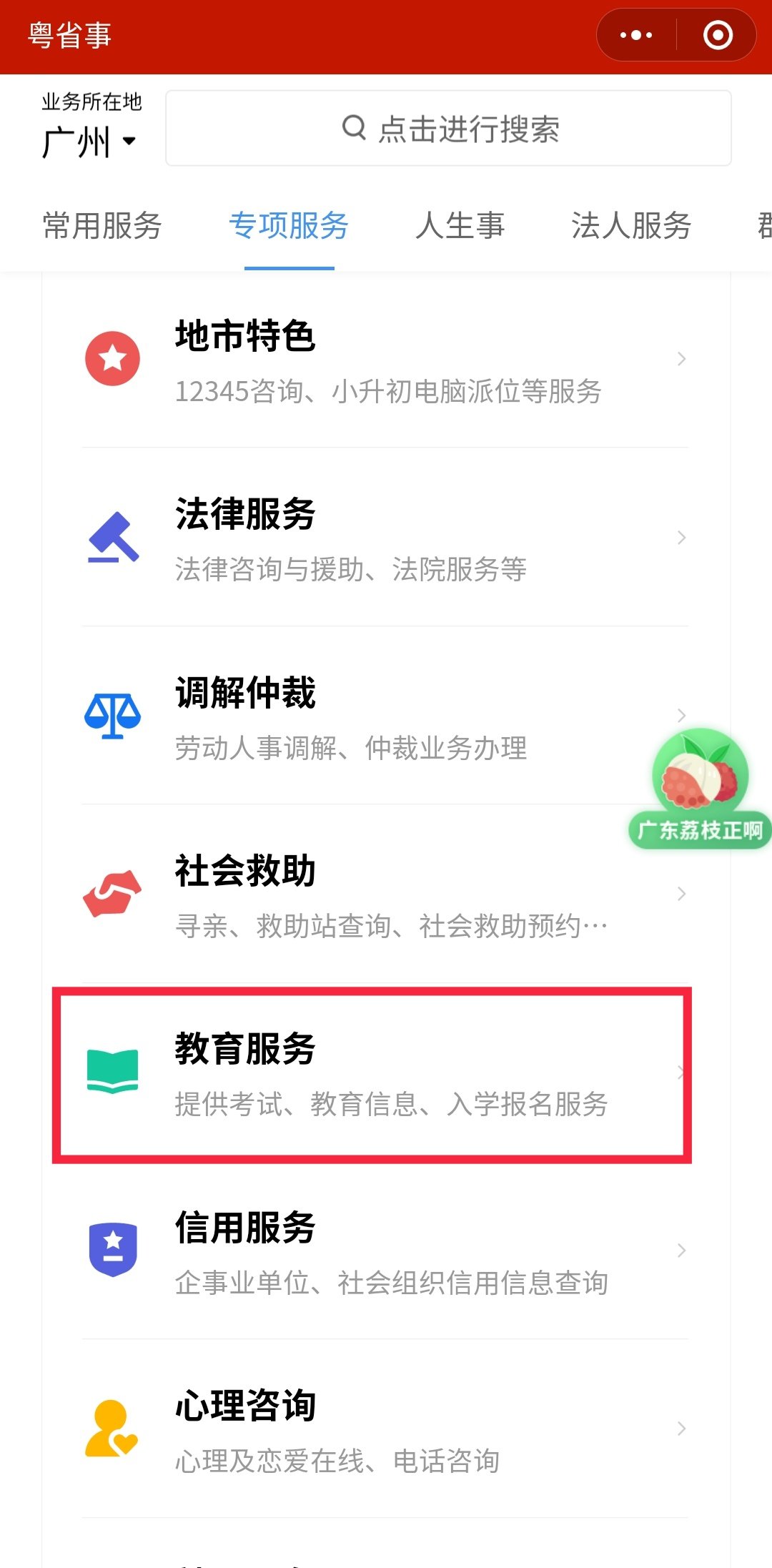 第二步:登录之后,找到“专项服务”中的“教育服务”,如下图所示: