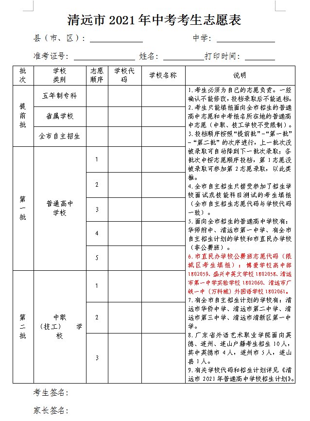 清远市2021中考志愿填报表 2021清远市中考志愿填报系统