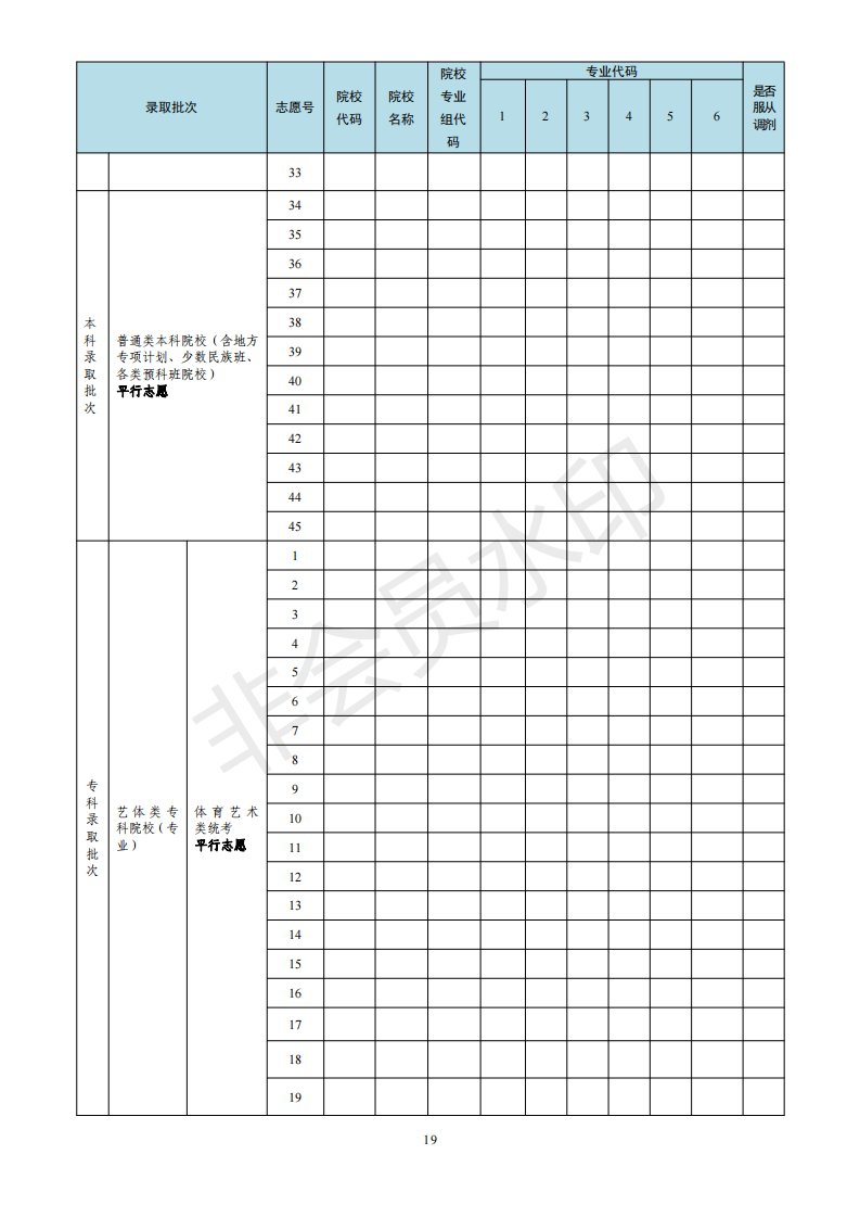 本科和专科录取批次普通类(物理、历史)均设1个平行志愿组,分别设置45个院校专业组志愿数,每个院校专业组设6个专业志愿和1个是否服从专业调剂选项。艺体类统考设1个平行志愿组,设20个院校专业组志愿,每个院校专业组设6个专业志愿和1个是否服从专业调剂选项。