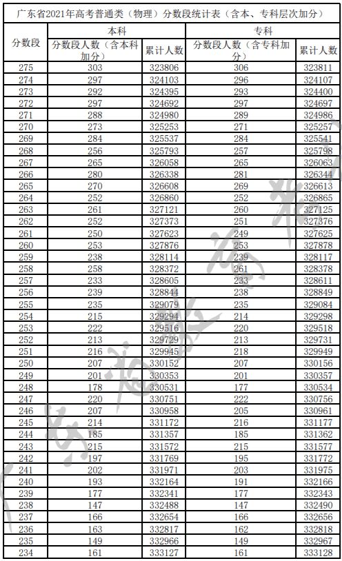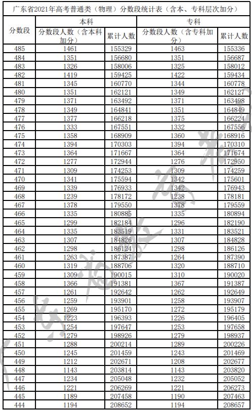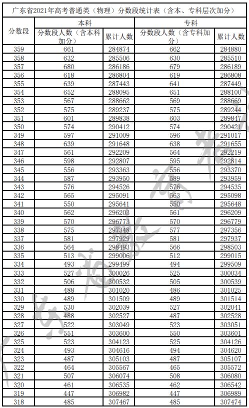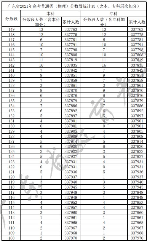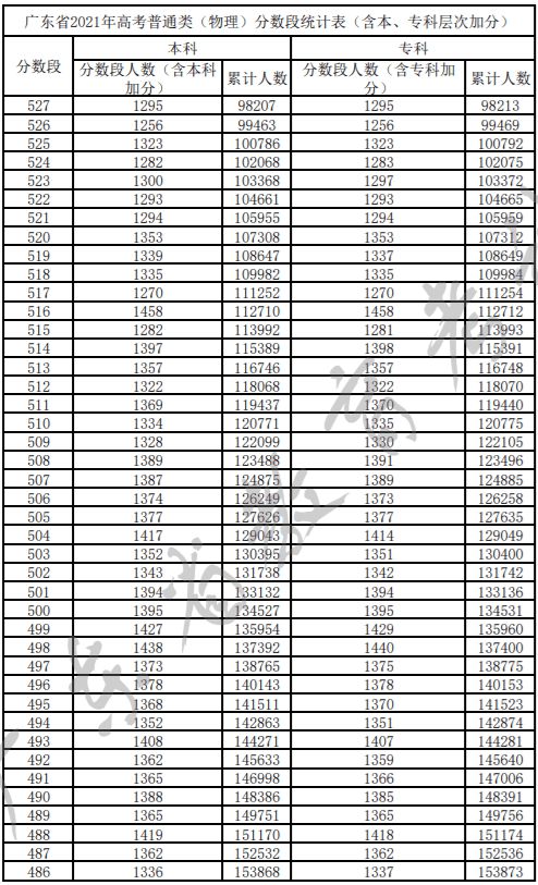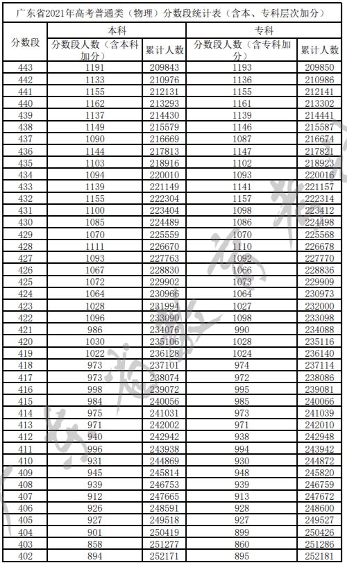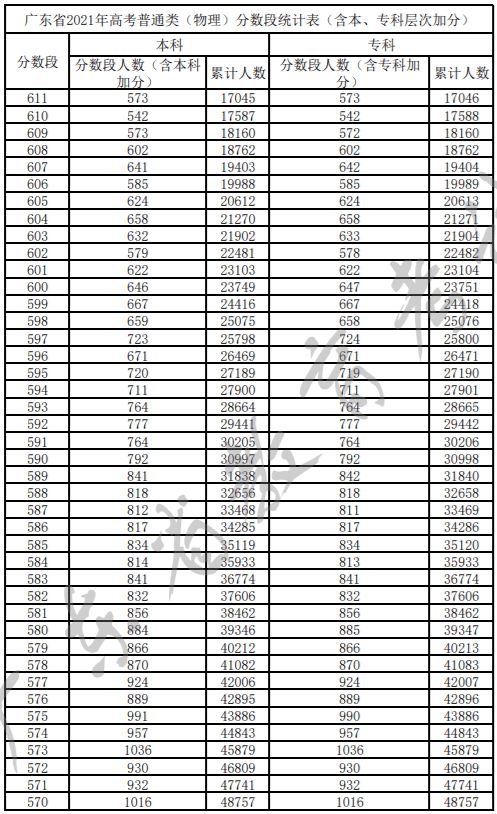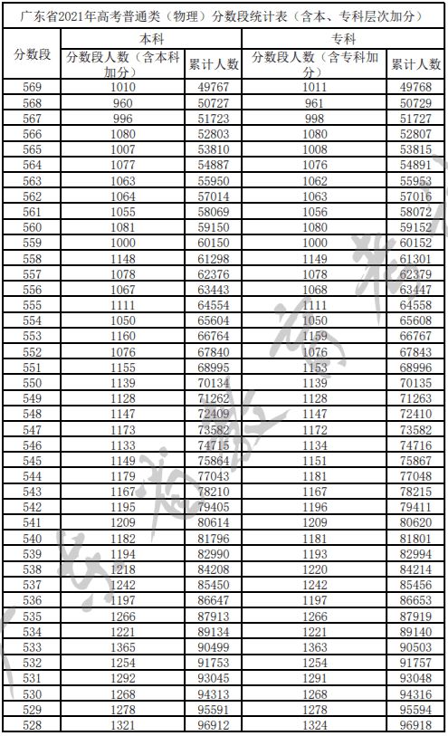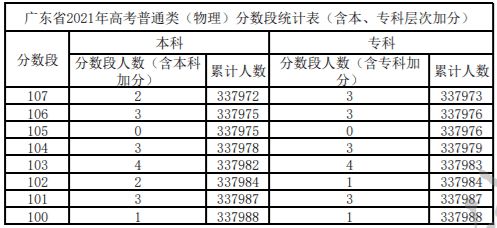 广东省2021年高考普通类(物理)分数段统计表(含本、专科层次加分)