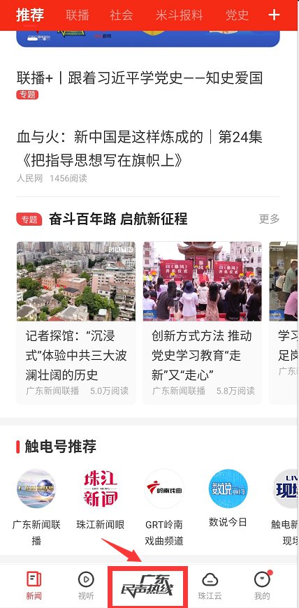第一步:需要先下载触电新闻APP,安装下载号之后,打开APP,在页面底下中间点击“广东民声热线“,如下图所示;