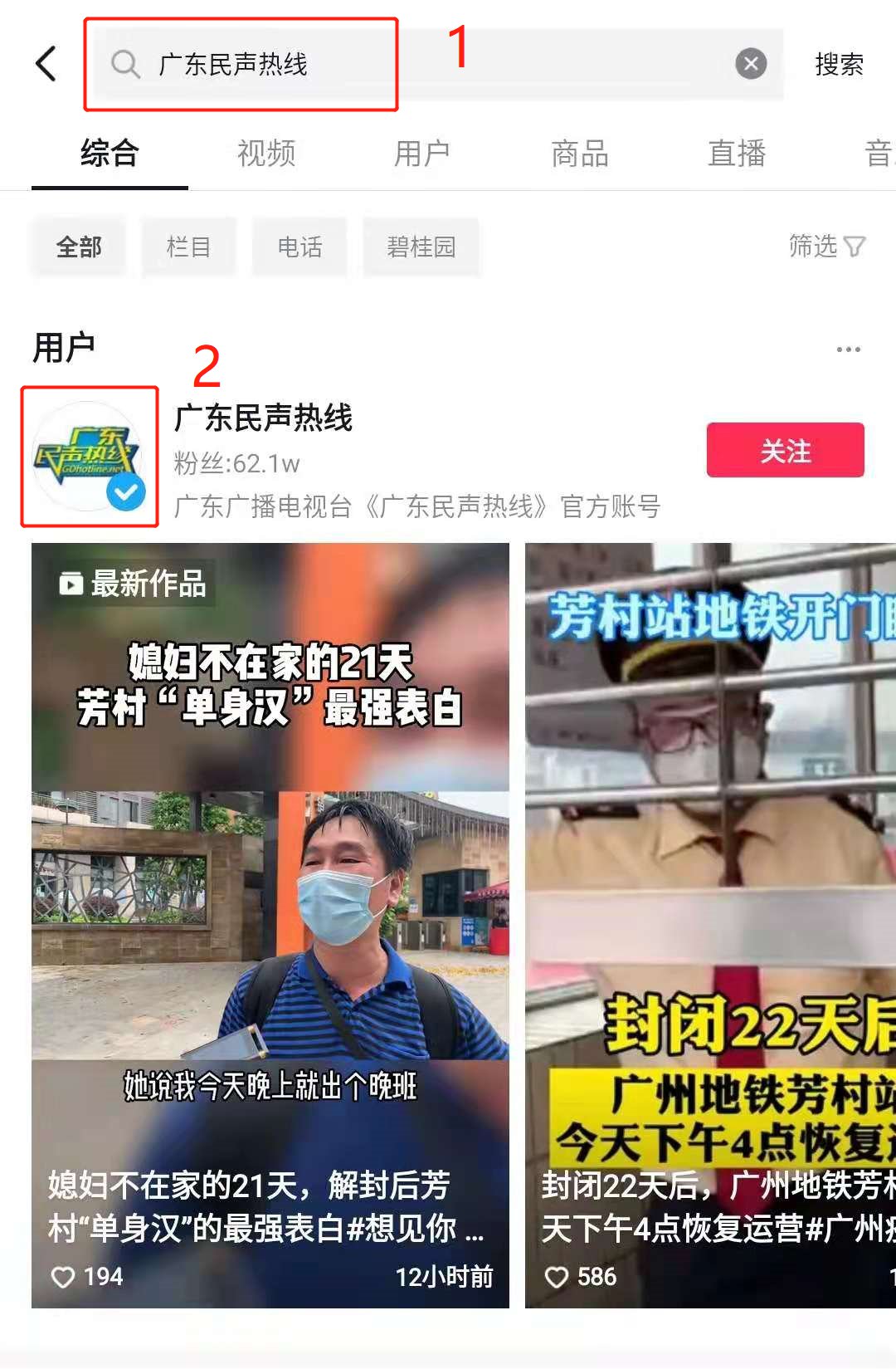 第一步:在抖音搜索框输入“广东民声热线”,如下图所示:
