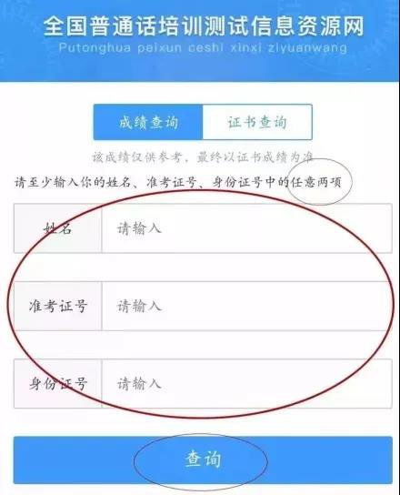 二、请至少输入姓名、准考证号、身份证号中的任意两项,点击“查询”。