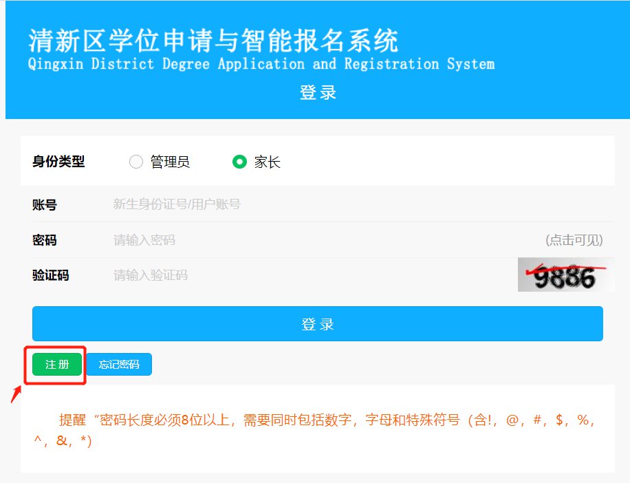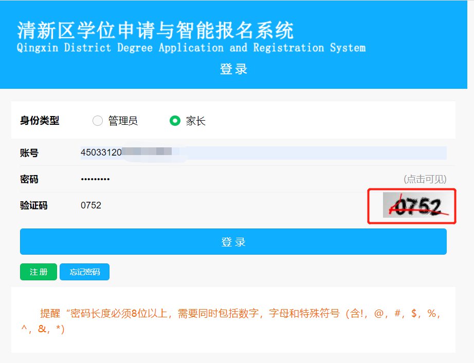 密码长度则要求必须为8位以上、必须包含特殊字符、字母、数字。按“点击可见”,可显示所输入的密码。由于密码强度要求高,设定时请务必记录好并妥善保管自己的密码,以便登录系统查看现场审核情况、录取结果等信息。 注册完成之后,系统会自动记录注册的账号,用户只需要输入密码、验证码(验证码只包含数字),即可登录。