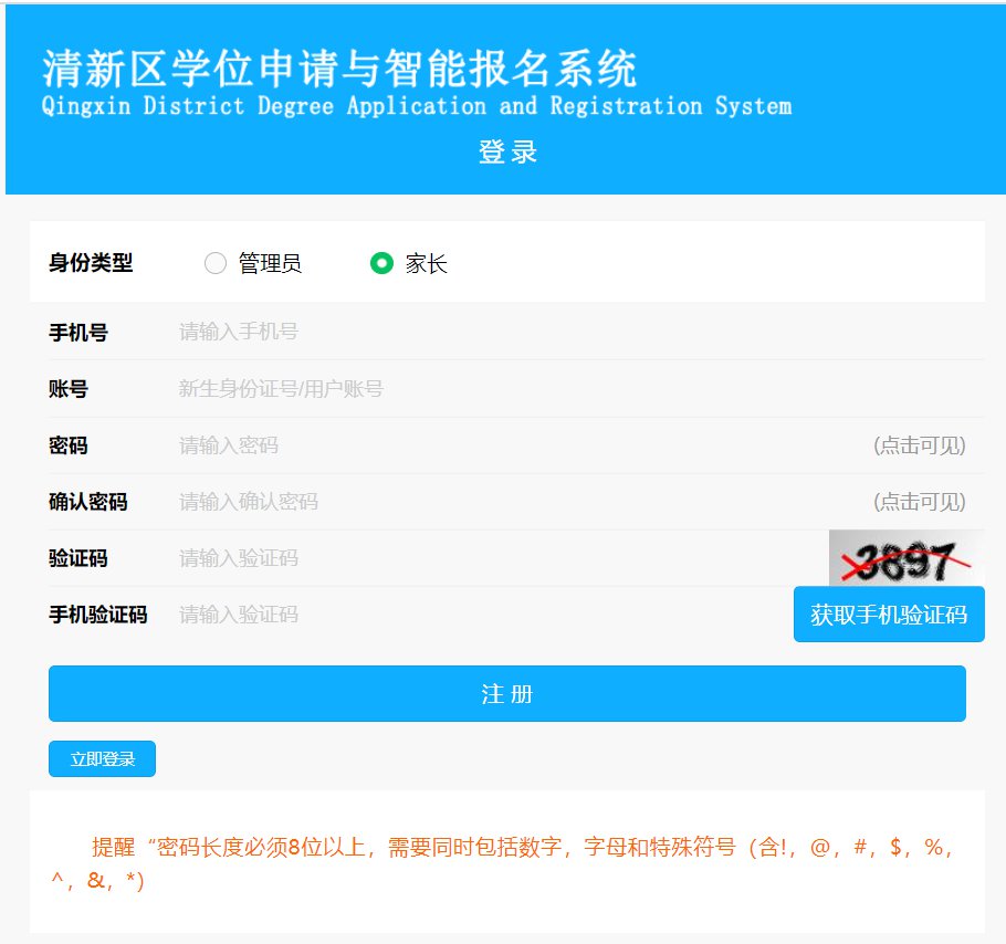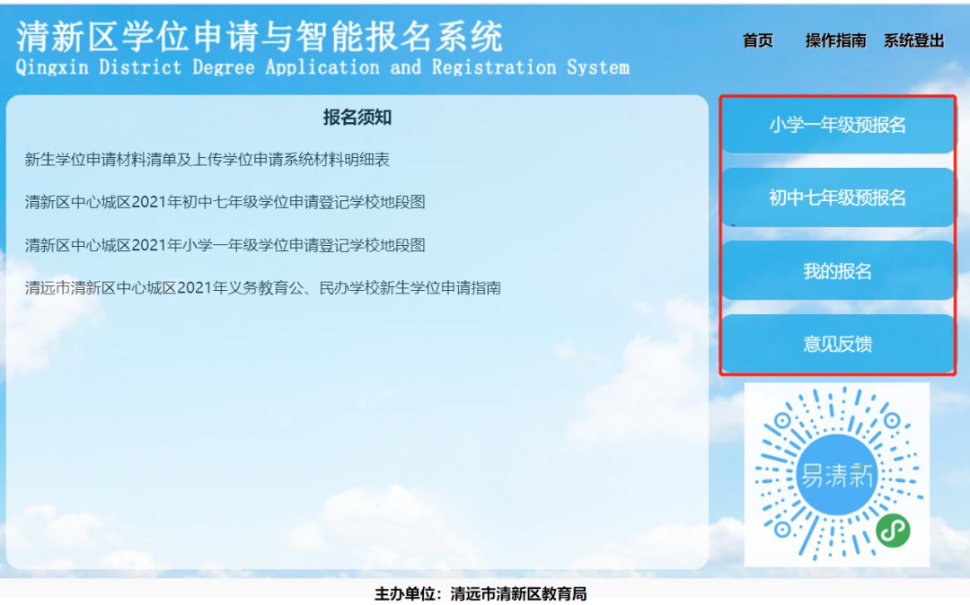 电脑端访问清远市清新区人民政府官网,通过政府网上的入口进入“清新区学位申请与智能报名系统”。微信端则通过“易清新”小程序上的入口,对系统进行访问。
