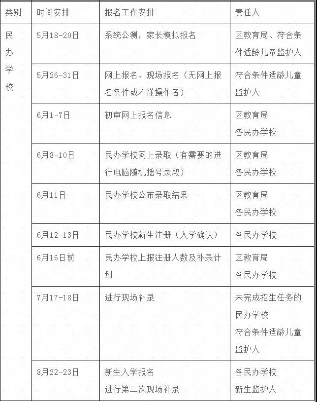 7月17-18日,8月22-23日,未完成招生任务的民办学校组织补录,区教育局根据各民办学校注册录取的情况,在系统公布未完成招生任务的民办学校名单和剩余学位数。有意向选择民办学校就读的适龄儿童,可到未完成招生任务的民办学校现场报名。