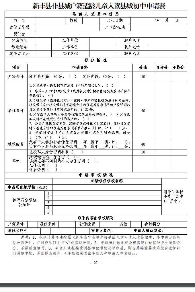 ➤新丰县非县城户籍适龄儿童入读县城初中申请表:
