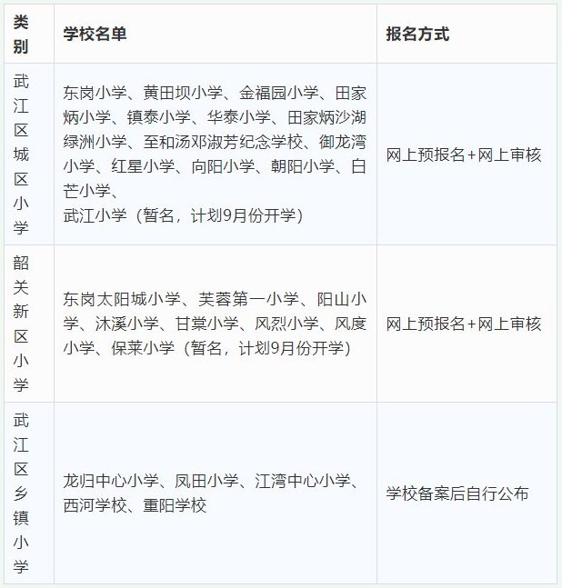 网络报名学校 | 1.执信小学2.赖新小学3.和平路小学4.建国小学5.站南小学6.南枫小学7.浈江小学8.韶阳小学9.沙梨园小学10.浈江区实验学校11.风采实验学校 | 网上报名审核+部分现场核查 |