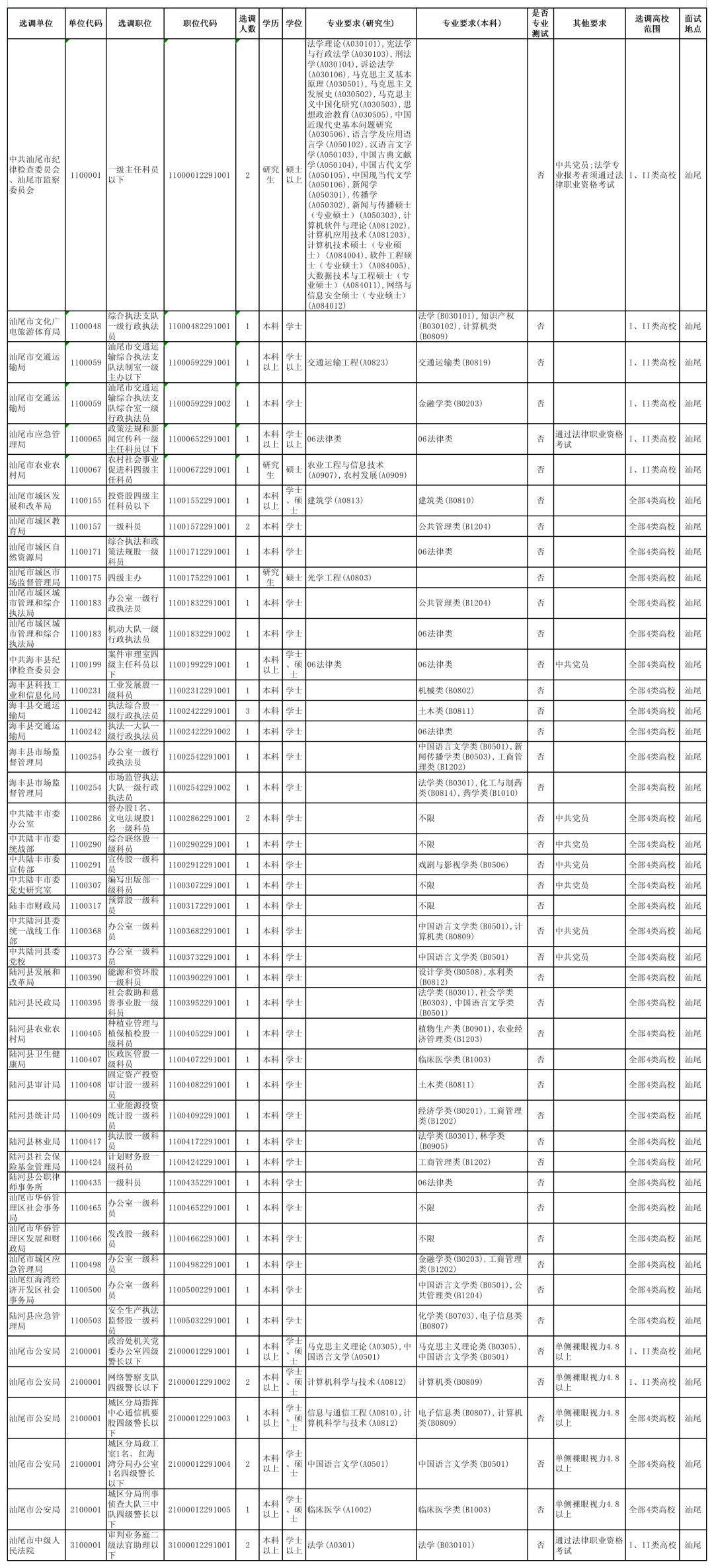 汕尾招录职位表