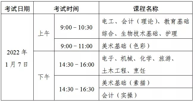 2022年1月专业技能课程考试开考课程为:《电工》《电子》《机械》《化学》《会计》《旅游》《美术基础》《教育基础综合》《音乐综合》《土木工程》《生物技术基础》《护理》《烹饪》和《体育》共十四门课程,其中《音乐综合》《美术基础》和《体育》三门课程不考理论,只考操作技能;《土木工程》只考理论,不考操作技能。