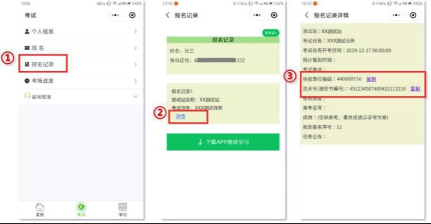(1)获得“湛江市非税收入缴款通知书号”和“执收单位编码”:打开“师圈”公众号点击“考试”栏点击“报名记录”点击“详情”复制“缴费通知书号”(粘贴后可看到内容)和“执收单位编码:440800156”。